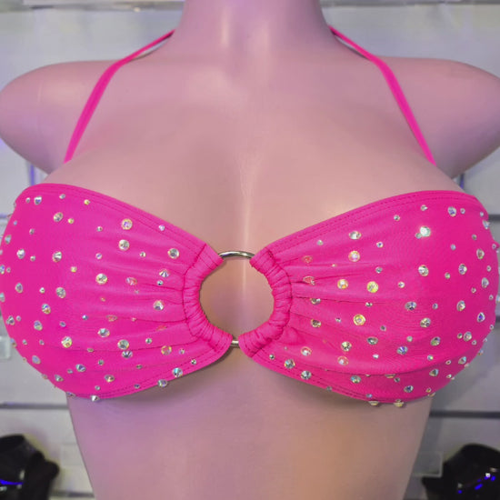 This stunning two-piece design is crafted from premium neon lime stretch lycra that glows beautifully under stage or club lighting. The bandeau-style top features a front ring detail that enhances your bust and adds a touch of bold glamour. 💎