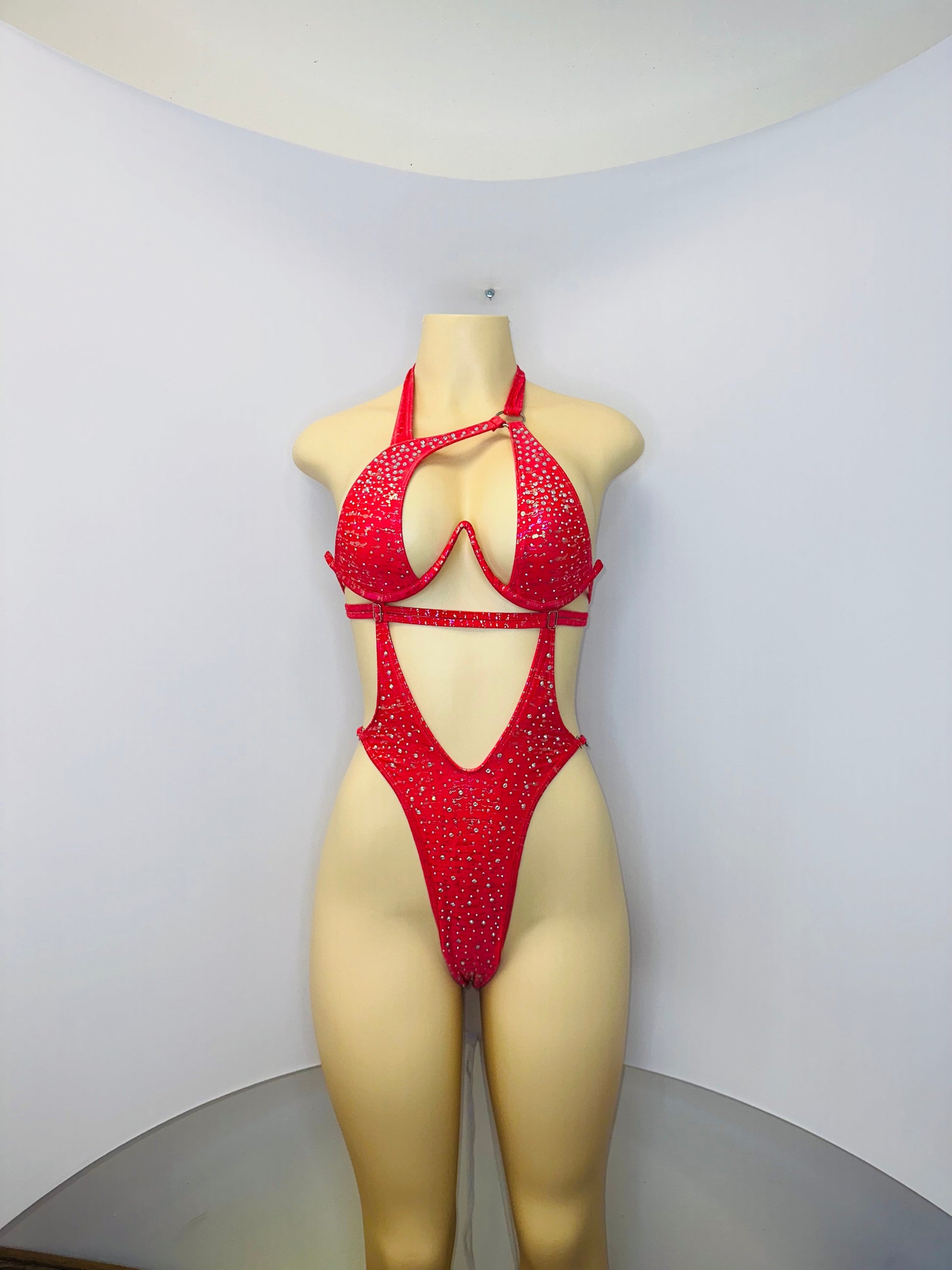 Designed with an adjustable halter neckline and flexible construction, it allows full freedom of movement while maintaining a body-hugging fit. The high-cut leg design visually elongates the body and highlights curves for a commanding stage presence. 🔥